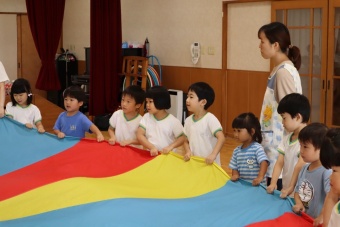 教えてあげる場面も見られました。運動会の本番のフィナーレで、団のみんなでパラバルーンをします!