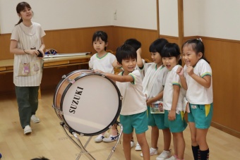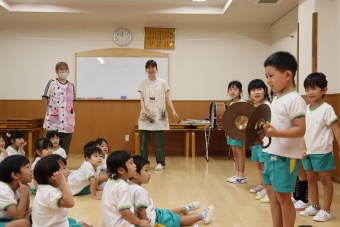 大きな声で応援します!年長さんが応援の掛け声をみんなに発表すると、