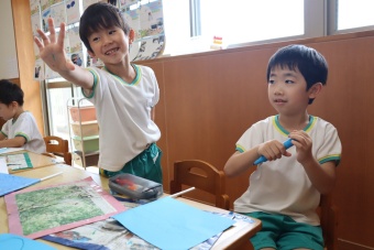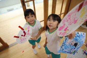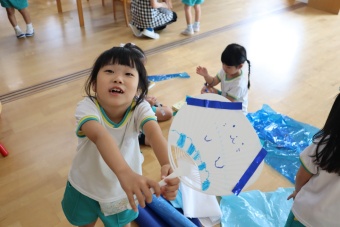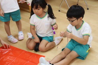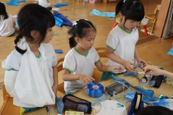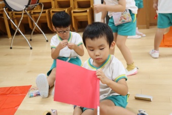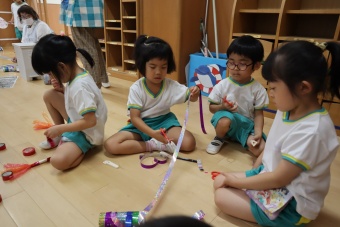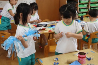 14日には、応援合戦に使う応援グッズを年長さんと年中さんで作りました。