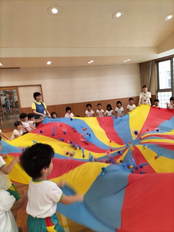 初めてみんなでバルーンを触った時は、ただただ楽しくてはしゃぐ子や、技が分からず、ただ流れに身を任せる子の姿が多かったのですが、昨日は技も格段にそろっていて、個人と言うより団全体で楽しんでいる様子でした!!