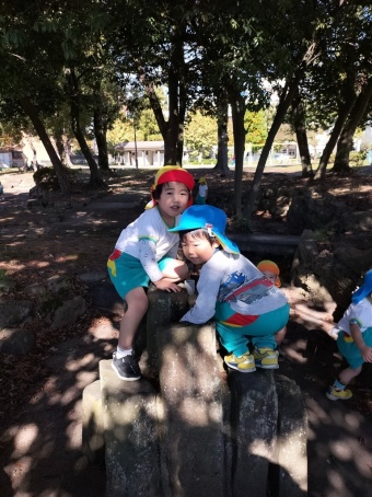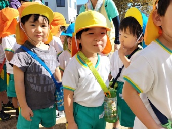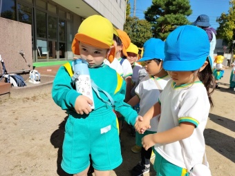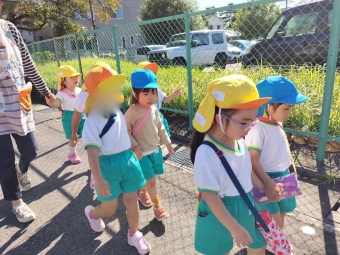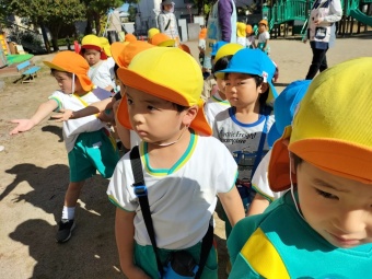 2歳児さんはお兄さん・お姉さんの遊びをみて真似してみたり、 「こっちにたくさんあったよ!」 と年少組さんが教えてくれた場所でたくさんどんぐりや落ち葉を拾いました。帰り道 「たのしかったね!」と年少組さんのAくんが話してくれました。「先生も楽しかったよ! とても頼もしかった!」と伝えると少し照れながら「また行きたい!」と行きよりもお兄さん・お姉さんの表情に変わっていました。