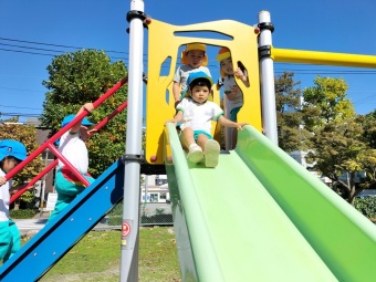 2歳児さんと年少組さんが初めて手をつないでお散歩へ行ってきました! ドキドキな表情な子供たち。 公園に着くと、 どんぐりや落ち葉を拾ったり、ブランコ・滑り台で遊んだり、公園を走ったり・・・ 。