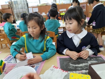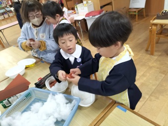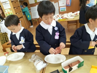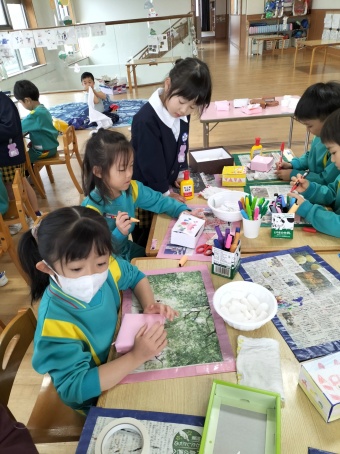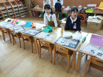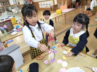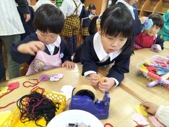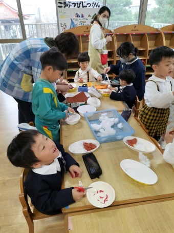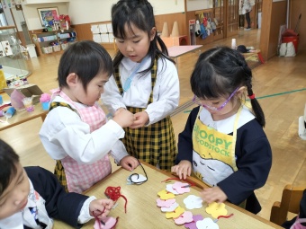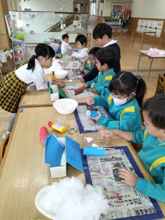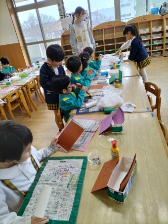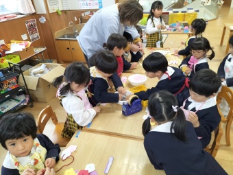 2023.12.07 立正キッズ日記 お店やさんの準備 すみれ組さんはお店やさんの品物を作るアルバイトを募集しました。 すると年少、年中のお友達が「作りたい!」と大賑わい! 作る材料がなくなってしまって今日はおしまい。 たくさんの品物を作ることができました!