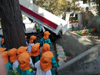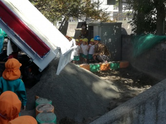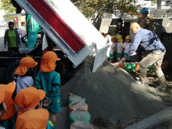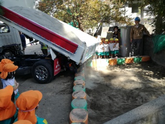 2018.10.22 立正キッズ日記 お砂場の砂が増えました! 遊んでいるうちにだんだん少なくなってきたお砂場に、新しい砂を追加で運んでもらいました。 その様子を年少組さんが見せてもらいました。 ザザザーと、ダンプカーから音をたて流れ落ちる砂を見て、年少組さんからは歓声が湧きましたました。 たっぷりたまったお砂で、また沢山遊びましょうね。