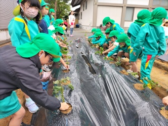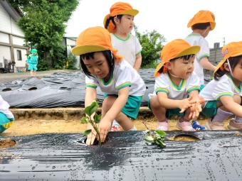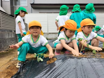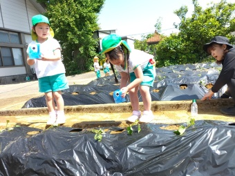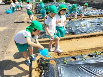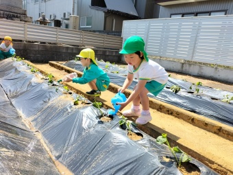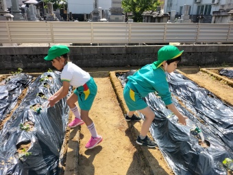 2024.05.22 立正キッズ日記 苗植え 今日はみんなでさつまいもの苗を植えました。まずは土を掘って斜めに植えてみました。 最後には「大きくなりますように」とお願いしました。 明日から根がはるまで、毎日水やりを頑張ります!秋には大きなお芋になるかな〜、楽しみですね!