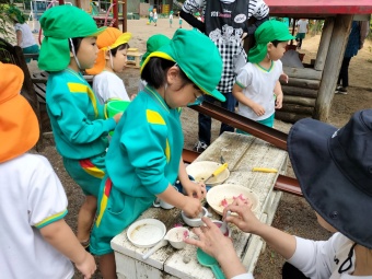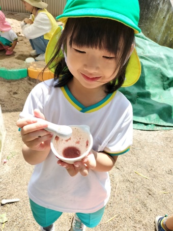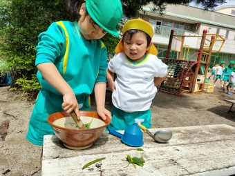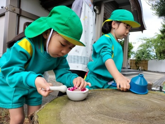 最近園庭では様々な葉っぱや花を探して、砂場ではすり鉢を使ってすりつぶしてみるのが流行っています。