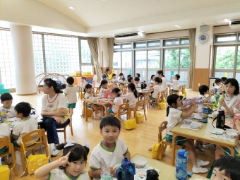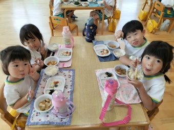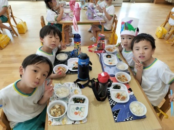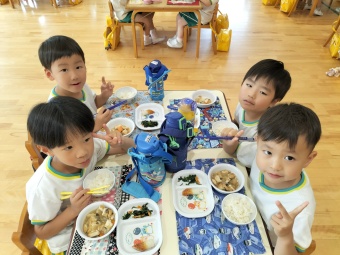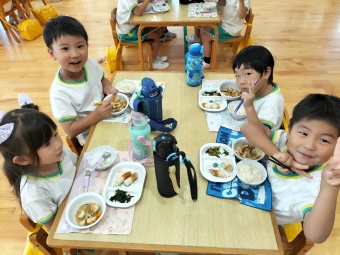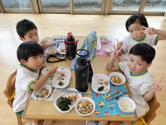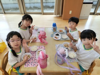 2024.06.27 立正キッズ日記 サメ団 団ランチ 今日は「サメ団」が揃ってみんなで給食を食べました。 ランチ会では 「お名前何〜?」 「◯◯だよ〜」など、年長のお兄さんお姉さんから積極的に声をかける姿が見られました! 本番までたくさん仲良くなって思い出に残る運動会にしよう!