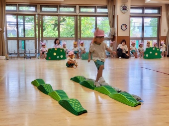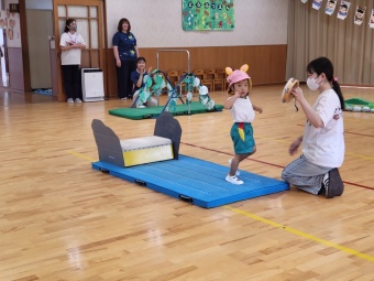 2歳児さんたちのテーマは「動物園へ行こう!」です。日に日に自分でできることが増えている『生活面』、そして子どもたちが大好きな『運動』を組み合わせて、1つの競技にしました。動物になりきって体操や競技に楽しく取り組んでいましたね。友達と一緒に微笑む可愛らしい姿、真剣に頑張る頼もしい姿が見ていただけたと思います。