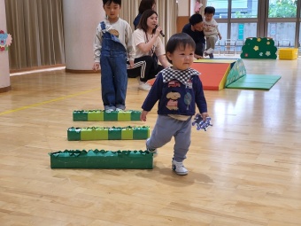 0,1歳児さんのテーマは「ワンワンと遊ぼう!」でした。ママ、パパの元へかけっこしたり、ワンワンに食べ物を運んで食べさせてあげる競技を行いました。「ワンツーパンツー!」の踊りでは先生の動きを真似して、楽しそうに踊っていました。とても可愛かったですね!