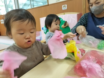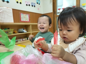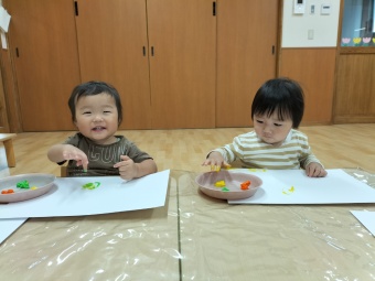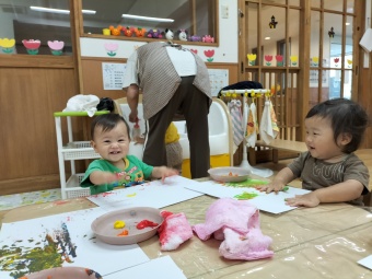 手を使って絵の具で絵を描いたり、様々な感触を味わいながら楽しんでいます!