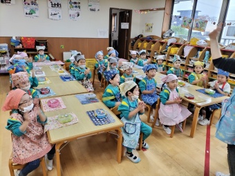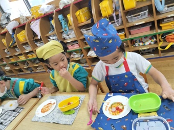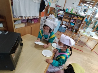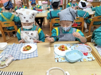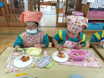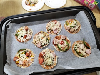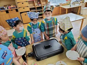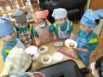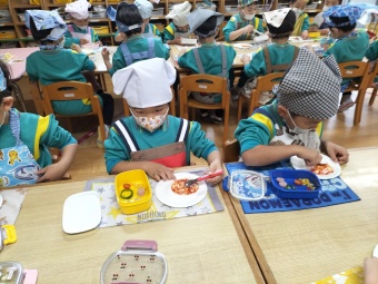 2024.11.26 立正キッズ日記 年中さんピザ作り 年中さんはみんなでピザを作ってみました! 生地にソースを塗って、思い思いの具を載せて焼きました。 ピザの匂いでお部屋はとてもいい匂い! お腹が空いてきます。。。 上手に焼けたかな? みんな美味しそうに食べていました