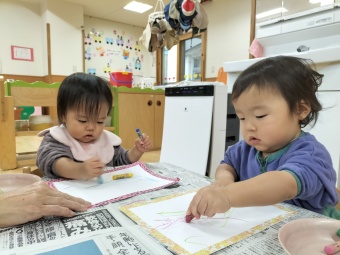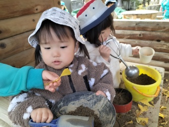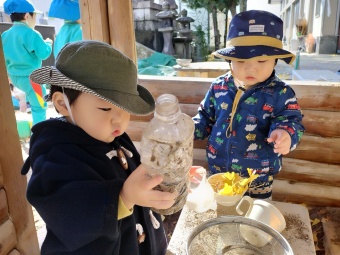 2024.12.12 立正キッズ日記 つぼみ組、ふたば組 つぼみ組さん、ふたば組さんは毎日園の内外で自由に楽しく遊んでいます。 色んなものの感触や見た目に興味を持ち、様々な遊び方を試します。 真剣な表情もとても可愛いですね!