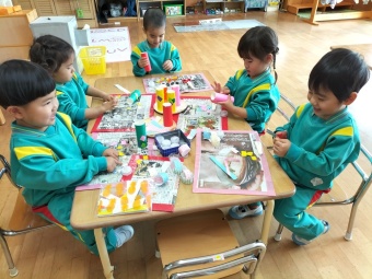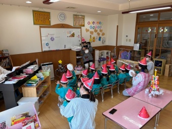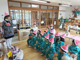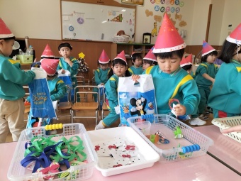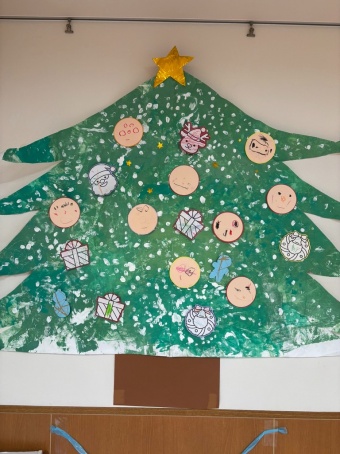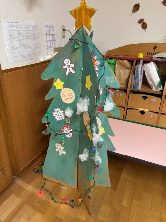 2024.12.25 立正キッズ日記 クリスマス 2歳児 クリスマスのお話を聞いたことがきっかけで、もも組・いちご組で3つのグループに別れてツリーを作ることにしました。子どもたちとどんな飾りを作りたいか話し合い、楽しみながら作りました。 みんなで作ったツリーをお部屋に飾り、クリスマス会をしました。 サンタの帽子を被り、お歌を歌ったりプレゼント探しやくじ引きをしました、 素敵なクリスマスになりました!