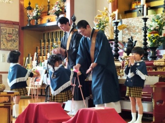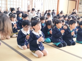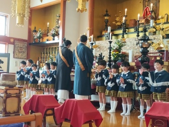 2025.02.18 立正キッズ日記 涅槃会 2月15日はお釈迦様が亡くなられた日です。14日に子どもたちはお寺の本堂に集まり、一緒に涅槃会の法要を行います。手を合わせてみんなでお参りし、お歌を歌い、園長先生のお話を聞きます。 お釈迦様はみんなの近くにいて、いつも見守っていてくれているということを再認識し、感謝することができました。 幼稚園で毎朝言う「ちかいのことば」を忘れず、毎日を過ごしましょうね。