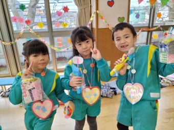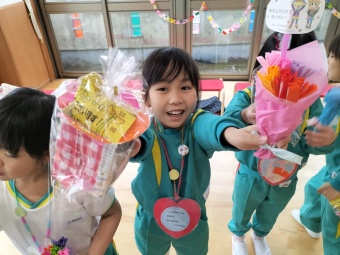手作りの花束やペンケース、首飾りのプレゼントを渡して日頃の感謝を伝えました。