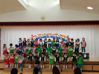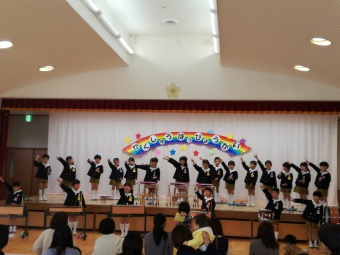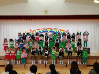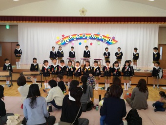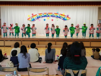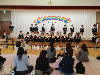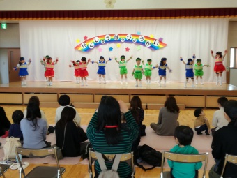 2018.11.28 立正キッズ日記 親子サークルさんご招待 今日は親子サークルの2歳児さんをご招待して、年少組年長組さんがダンスとお歌のプレゼントをしてあげました。 学習発表会で一度披露したお歌とダンスなので、子供たちはあまり緊張せず出来ました。