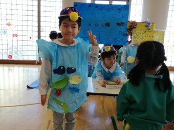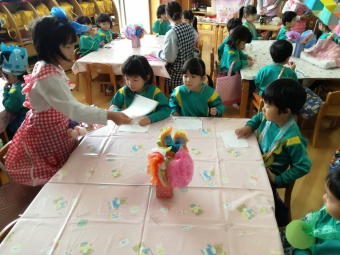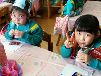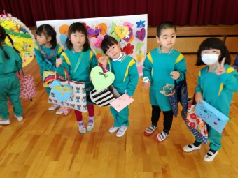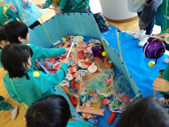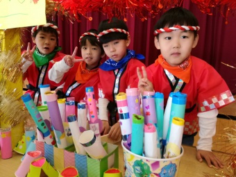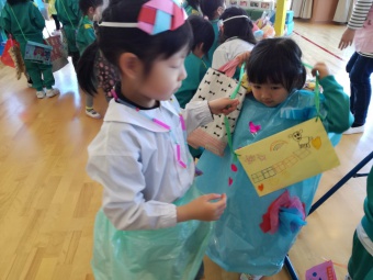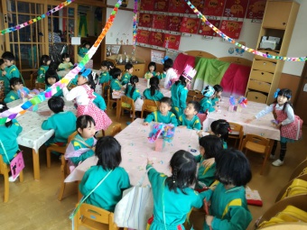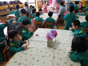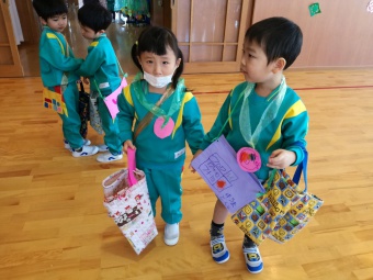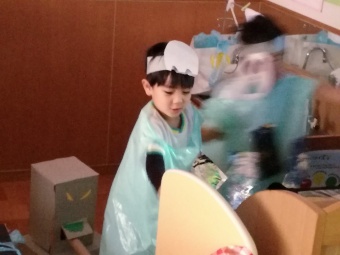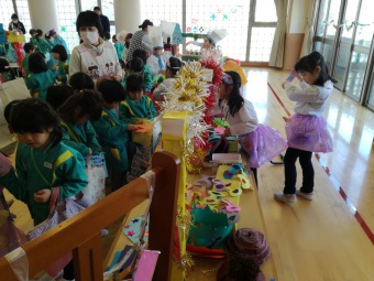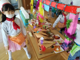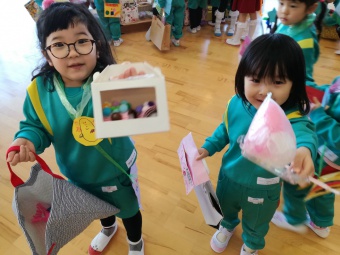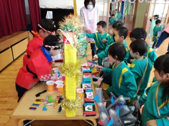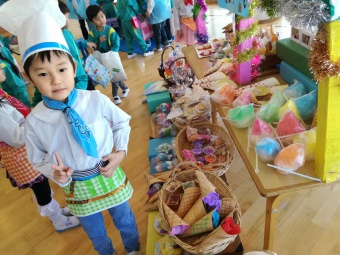 2019.01.25 立正キッズ日記 お店屋さんごっこ 今日は待ちに待ったお店屋さんごっこの日。この日のために年長さんは廃材や折り紙などを使い手の凝った品物を沢山作り上げました。威勢のよいかけ声につられ、小さいお客さん達は初めてのお買い物を楽しみました。