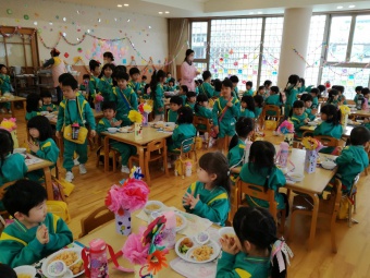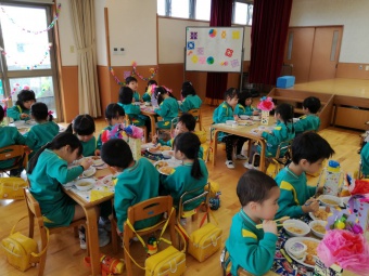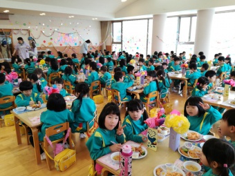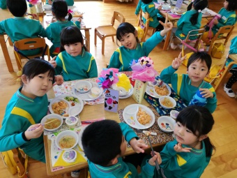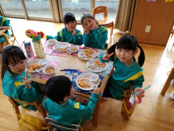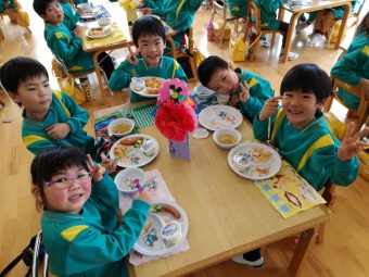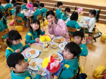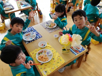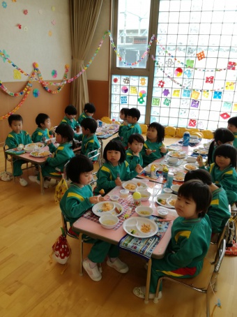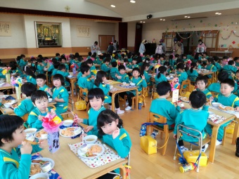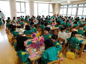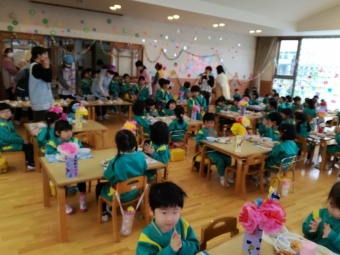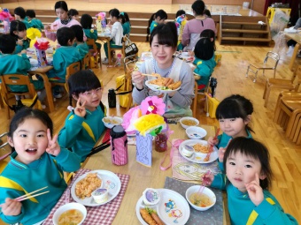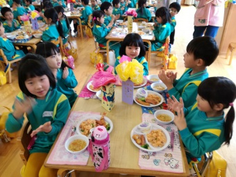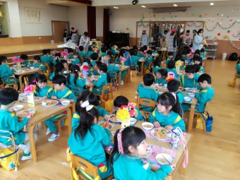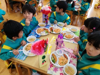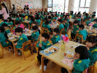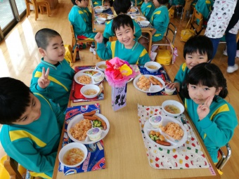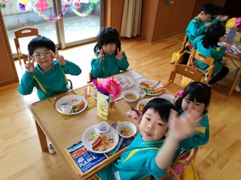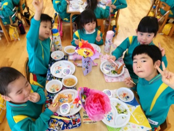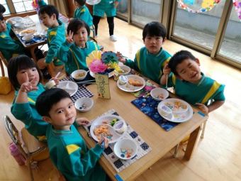 2019.03.06 立正キッズ日記 お別れ会食 今日は、年長組さんをご招待してのお別れ会食でした。 この日のメニューはいつもより豪華でおいしそう! 年長さんは、ちょっぴり照れながら小さいお友達の中にはいり、一緒にご飯を食べました。 食べた後はカラオケ大会もして、大盛り上がり。 少しずつ年長さんとnoお別れも近くなってきましたね。