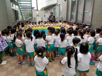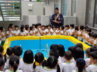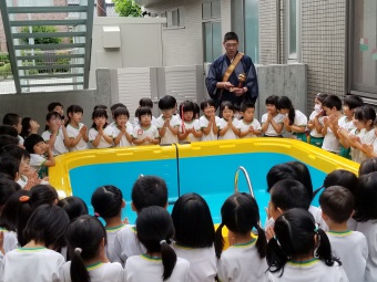 2019.06.28 立正キッズ日記 今年大型プールが入りました! 今年初めて大型プールを導入しました。 今までのビニールプールも、楽しかったのですが、これからは沢山のお友達が一緒に入れることになります。 プール開きの前には園長先生に安全のお参りをしてもらいました。 こちらのプールは、年少さん以上のお友達が使うことになりますが、安全に気をつけて楽しくプール遊びをしていきます。