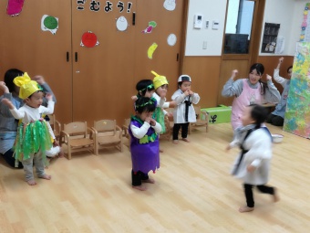 2歳児さんは、お腹をすかした大きなにわとりさんに、りんご、お魚、とうもろこしなどをあげました。そのあとは手作り楽器をならしながらみんなでおうたを歌いました。