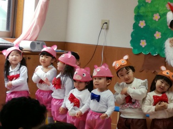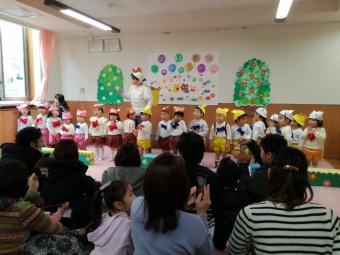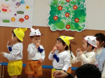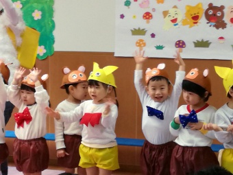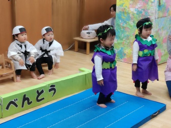二階のホールでは賑やかなお祭りごっこが行われていますが、下のお部屋では、2歳、1歳、そして0歳児さんの生活発表会も同時に行われていました。