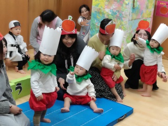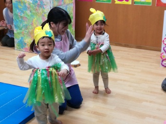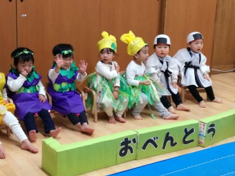1歳、0歳児さんもひとりひとり可愛い衣装を着せてもらい、近くでみているお父さんお母さんたちに目一杯アピールすることが出来ました。