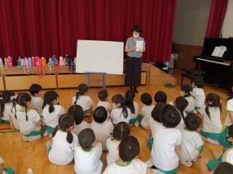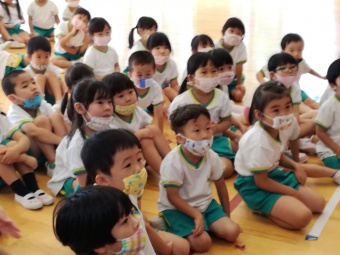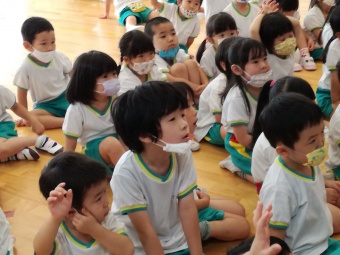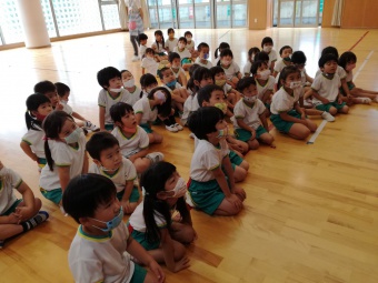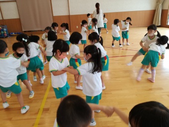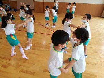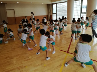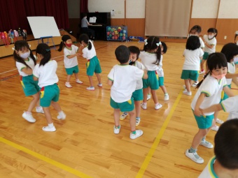 2020.07.09 立正キッズ日記 リトミック教室 体育教室に引き続き、リトミック教室も本日より再開しました。 先生の弾かれるピアノの音に合わせ、子供たちはリズミカルに体を動かします。 ゆっくりとした音には、ぞうさんのように。早く小刻みな音には、りすさんのようになりきって動きます。 体を使うと同時にお耳もすませていないといけませんね。 写真は本日の年中さんの様子です。