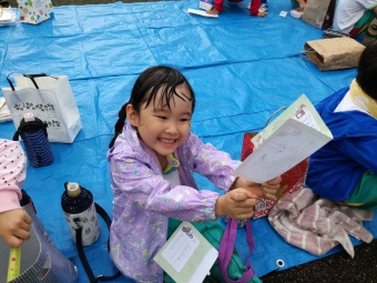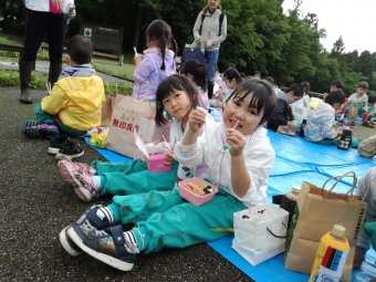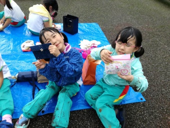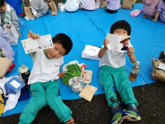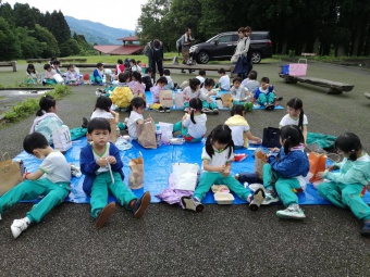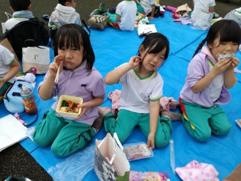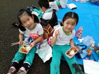 手や足を一杯に使い戻ってきた子供たちは、おなかぺこぺこ。楽しみにしていたお弁当タイムです。