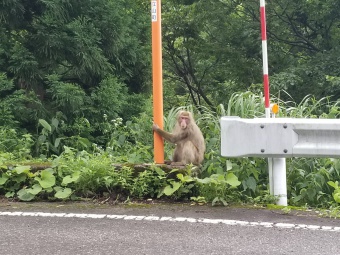 自然の家を目前に、なんとさるの群れが道路に沢山!