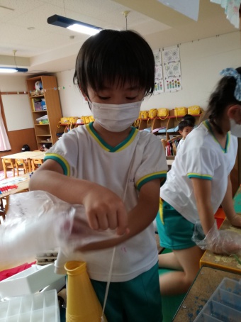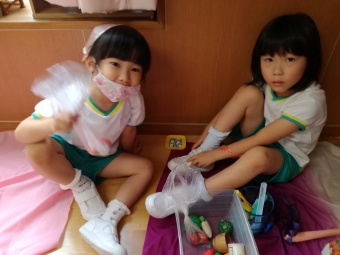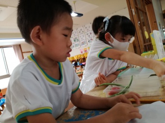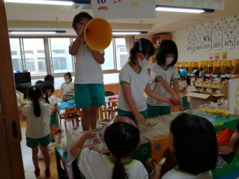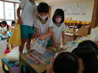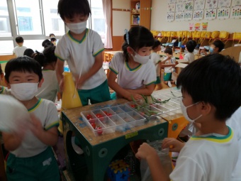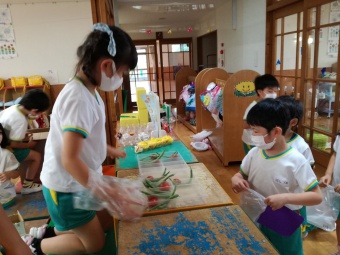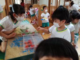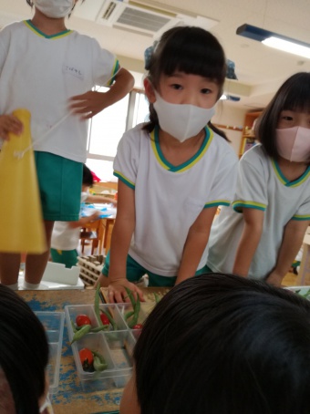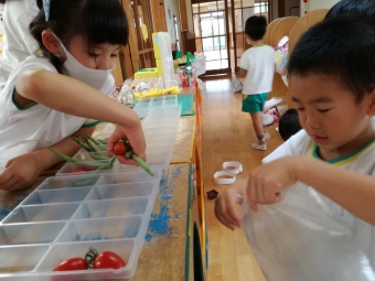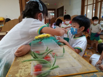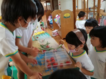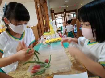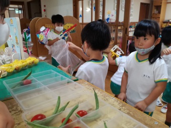 2020.07.28 立正キッズ日記 夏野菜!!収穫!! 4連休の間、園の野菜がすくすくと沢山実っていました。 収穫した野菜を並べて、年長さんの教室はなんと即席八百屋さんに!! 子供たちは八百屋さんになりきって、呼び込みをかけたり、買い物にいくなど、様々な役割で楽しんでいました。 お家に持ち帰った野菜はおいしかったですか??
