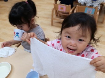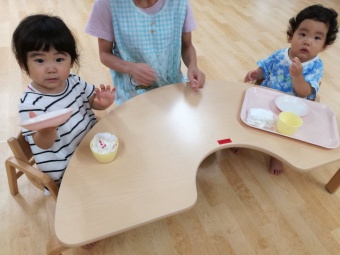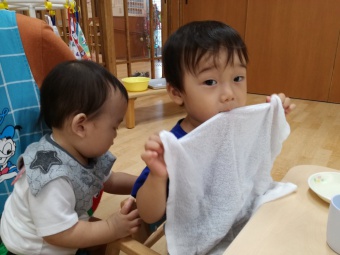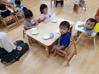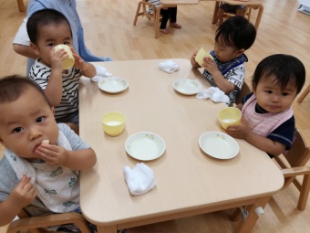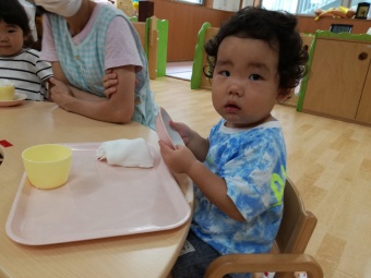 2020.07.30 立正キッズ日記 おやつ大好き 0,1歳児クラスのお友達です。おやつの時間にお邪魔しました。 みんな落ち着いて食べていますね。いないいないばーー!っと、おちゃめなカメラ目線のサービスショットです。