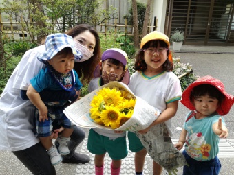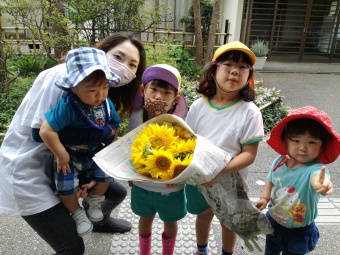 2020.08.08 立正キッズ日記 ひまわり 本日は土曜保育です。 近くを散歩にでかけ、帰ってきた子供たちが持っているのは、ひまわりです。 お散歩中、ご近所の方にいただいてきたようです。思わぬプレゼントに先生も子供たちもニッコニコ! ありがとうございました。