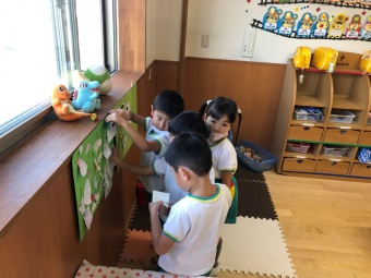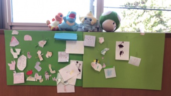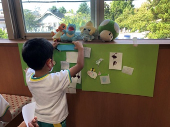 どうやら、先生が壁に貼ってくれたファミリーパークの案内図を見て、そこにいる動物たちを自分たちで考えながら作っているみたいです。数日見守っていた先生は、その後芝生に見立てた緑の画用紙を壁に貼ってあげると、その芝生の上は次から次へといろんな動物たちであふれてきました。