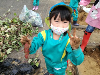今年のおいもは残念ながら豊作とはいえず、一人ずつのお土産とはならなかったのですが、給食のおばさんのご厚意で、本日の大根の味噌汁の中に掘ったさつまいもも加えていただき、みんなでおいしく頂くことができました。