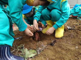 秋晴れの空の下、一生懸命土を掘ります。ちょこんと紫色の頭を出したさつまいもをみつけた子供たちは一喜一憂しながら、さらに掘り起し、出てきたおいもと初対面。