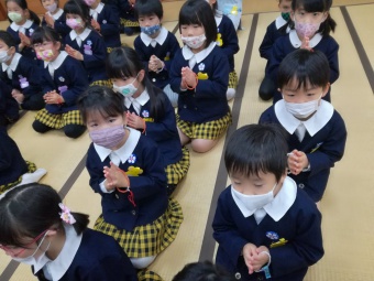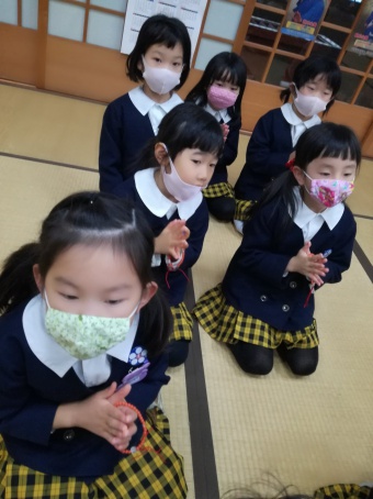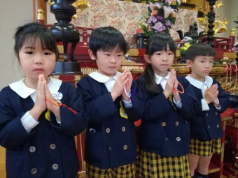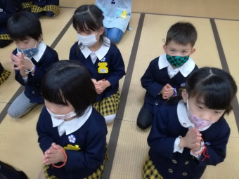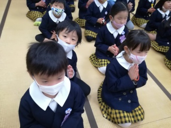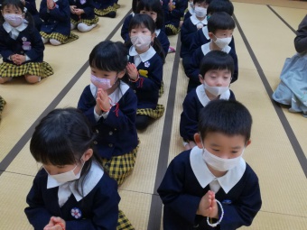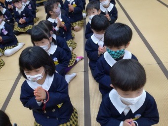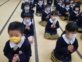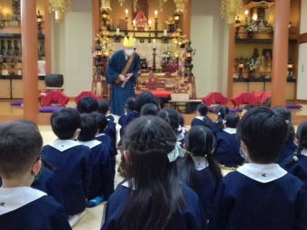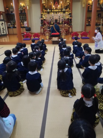 2020.12.08 立正キッズ日記 成道会(じょうどうえ) 例年であれば、全園児お参りする成道会も、今年は年長さんだけが本堂にて手を合わせました。 この日はお釈迦様がおさとりを開かれた日ということで、お参りの後は園長先生から分かりやすくお話もしていただきました。子供たちは真剣に話に耳を傾けました。お家に帰ってきたら是非聞いてみてくださいね。