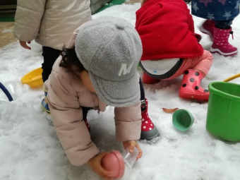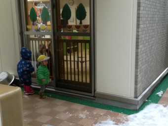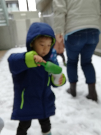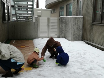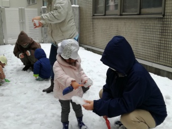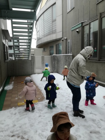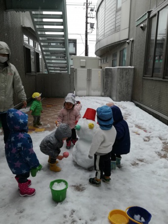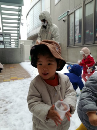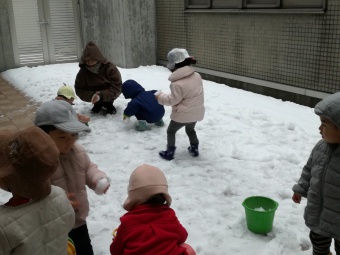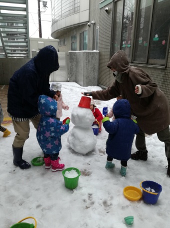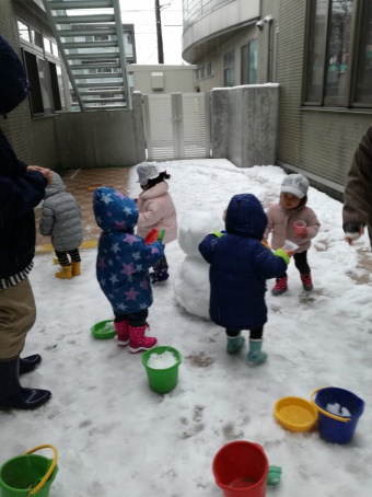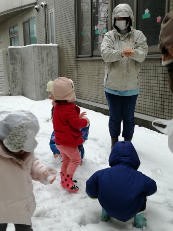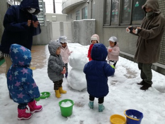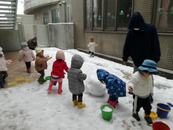 2020.12.15 立正キッズ日記 0.1歳児さん雪遊び 昨日の初雪で幼稚園の周りにも雪が積もりました。 0.1歳さん達にとっては、初めての雪遊び!! 冷たいのも、寒いのもぜ~んぜん平気みたいです。 「よいしょ!よいしょ!」と、雪だるまを作ってくれている先生を皆で応援! 大きな雪だるまにお目々とお口をつけてあげました。楽しかったね。