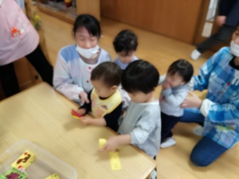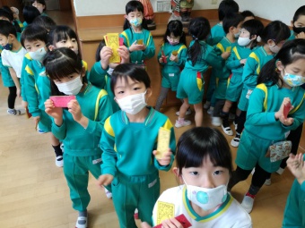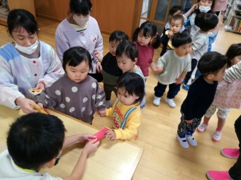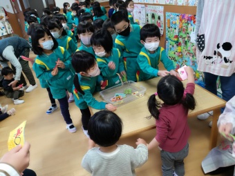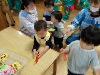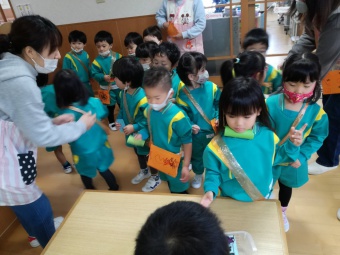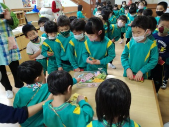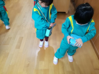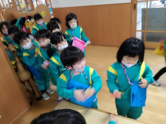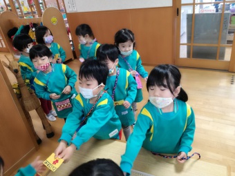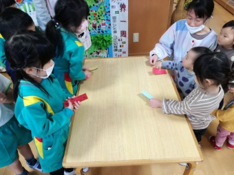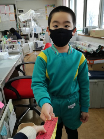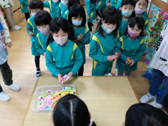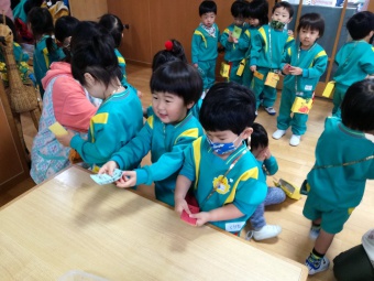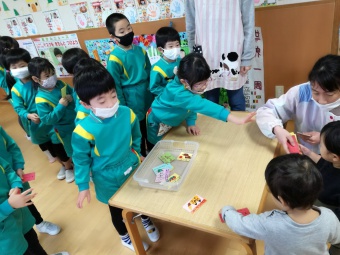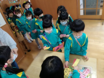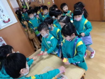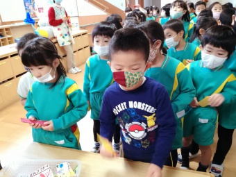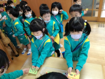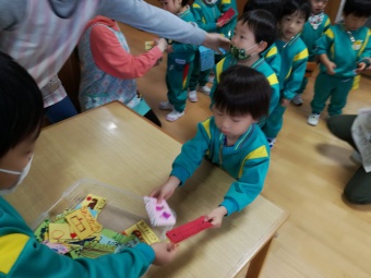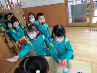 2020.12.18 立正キッズ日記 立正銀行開店~ 「いまから、銀行を始めます。来て下さい!」元気なかけ声で、立正銀行梅沢町支店が開店しました。 今日は、来週に控えているお店屋さんごっこにむけての、買い物券を交換するために沢山の子供たちが銀行前に並びました。 手作りの財布やかばんを持って、年長のお兄さんお姉さんからお買い物券をゲットできた子供たち。大事そうに財布やかばんにしまっている姿が微笑ましかったです。 来週のお店屋さごっこでは、どんな品物が並ぶのかな?早くお買い物したいですね。