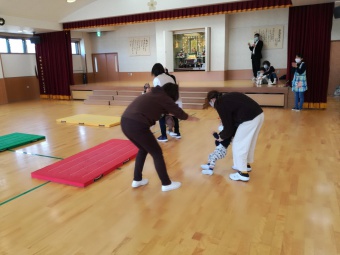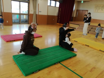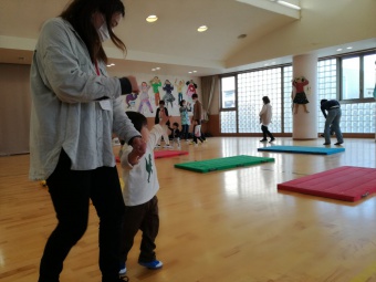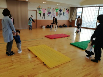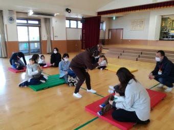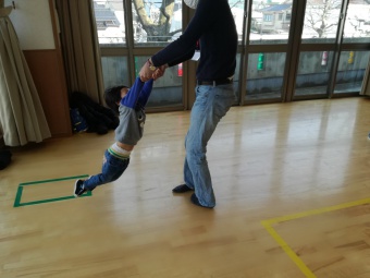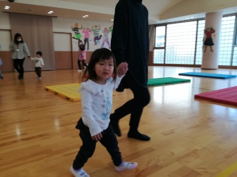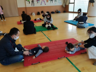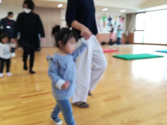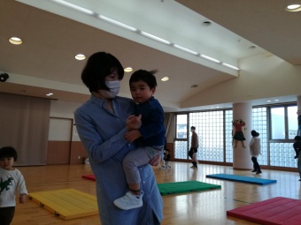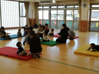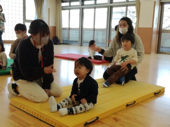 2021.02.13 立正キッズ日記 1歳児さん保育参加 こちらは1歳児さんの様子です。 広々とホールを使い、お家のかたと一緒に触れあい遊びをしました。 この日にやったおおかみさん、また幼稚園でもしましようね。
