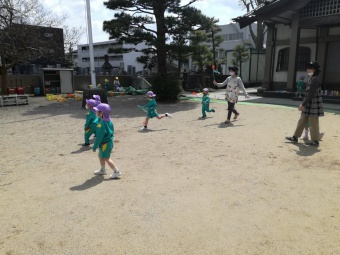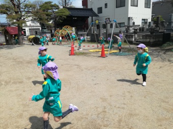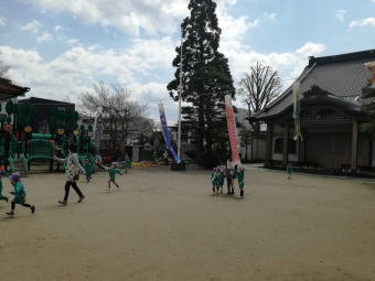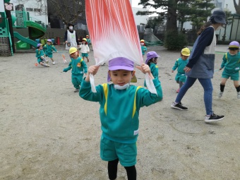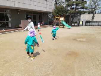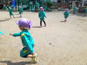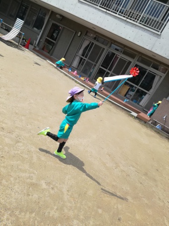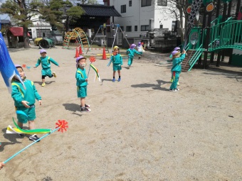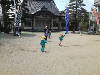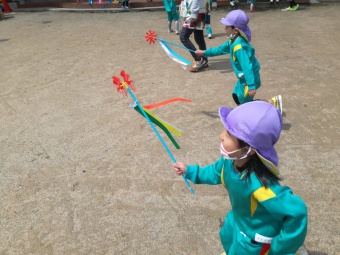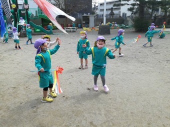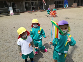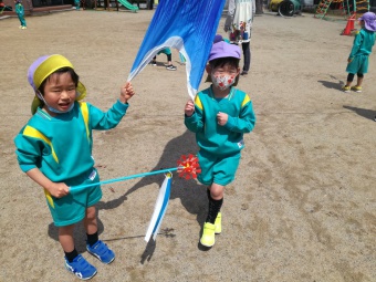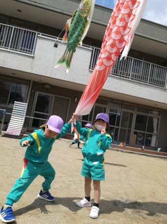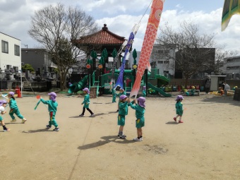 2021.04.19 立正キッズ日記 こいのぼりが泳いでるよ 青い空に色とりどりのこいのぼりが泳いでます。 こいのぼりの下では子供たちが大喜びで園庭をを駆け回っています。 教室で作った自分だけの吹き流しを持ち、風を受けながら走っている姿もこの季節ならではですね。 青空に、にこにこの子供たちの笑顔がまぶしかったです。