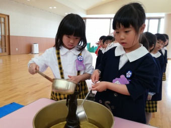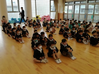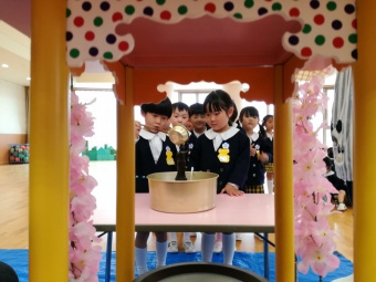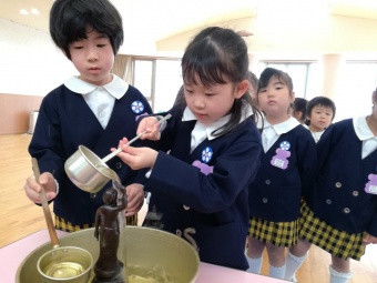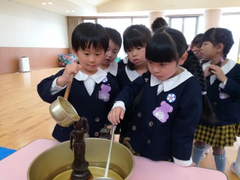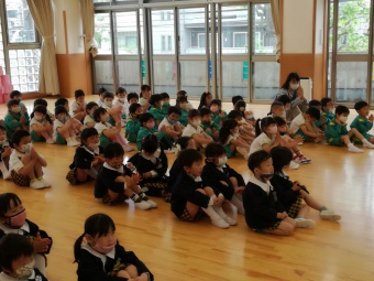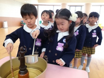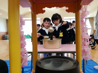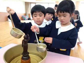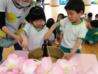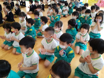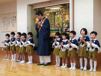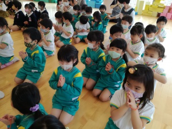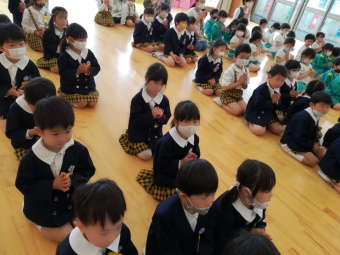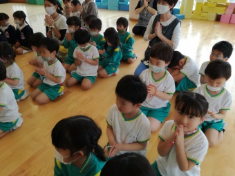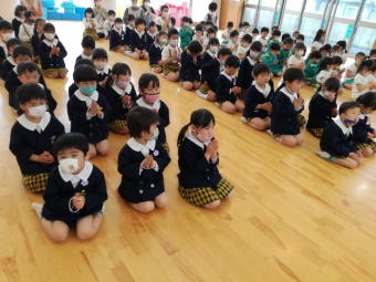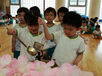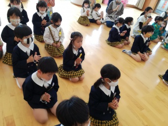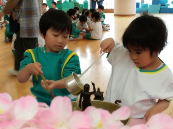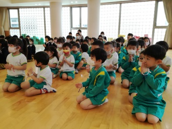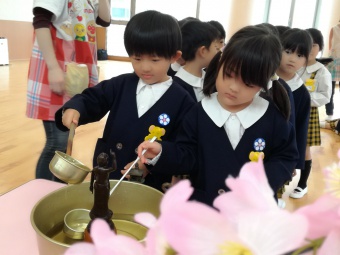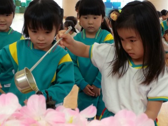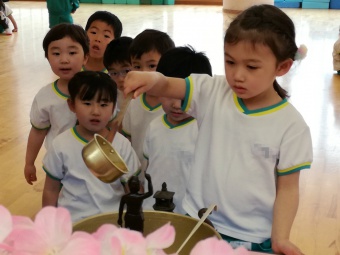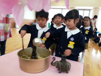 2021.05.10 立正キッズ日記 はなまつりのお参り 今日は、はなまつりのお参りをしました。 例年ですと、本堂で行うこの行事も、今年は幼稚園のホールで二回に分かれて行いました。 年長さんの献花・献灯のあとは、園長先生よりののさまがお誕生になった時のお話をしていただきました。 さあ、そのあとはいよいよののさまへの甘茶かけです。 ののさまがお生まれになったときに、空から甘い雨が降ってきたというお話をもとに、はなまつりではののさまに甘茶をかけます。みな慎重に、そして優しく「おめせとう」といいながらかけていました。 (写真は全員ではありません。)