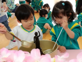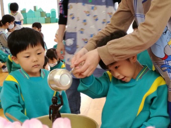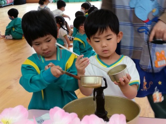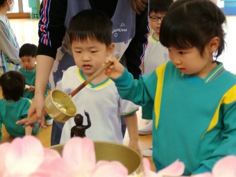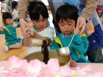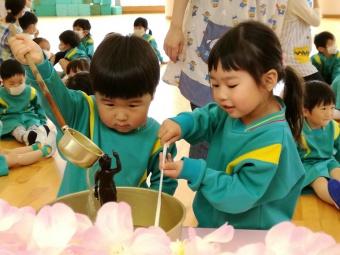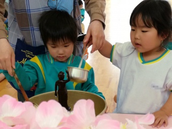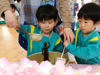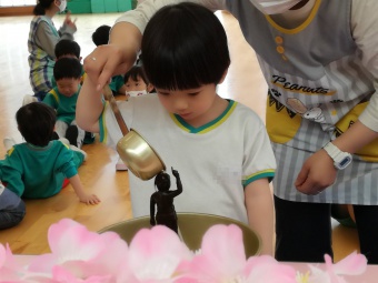 2021.05.07 立正キッズ日記 ののさまに甘茶をかけました 次は年少さんです。 みんな一生懸命お話をきいてから、ののさまに甘茶をかけます。ひしゃくを持つ手は小さく、でも眼差しは真剣そのもの!よい経験が出来ましたね。