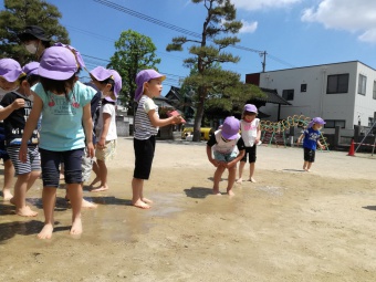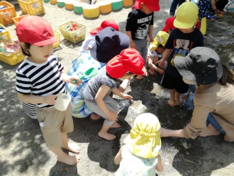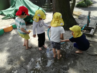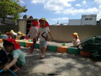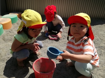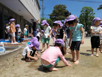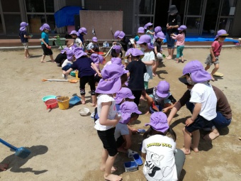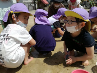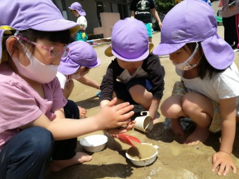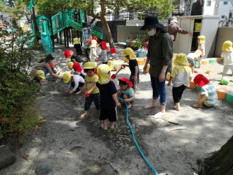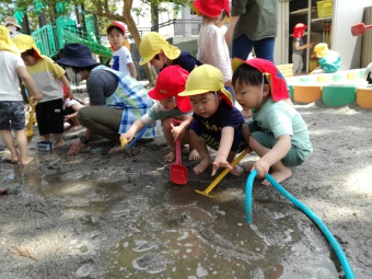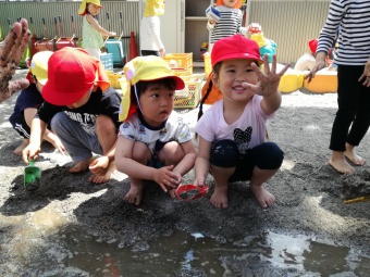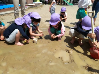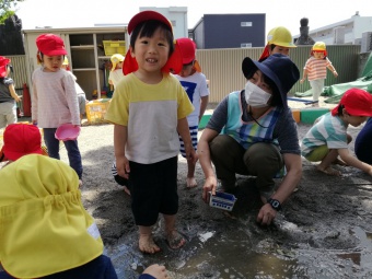2021.05.11 立正キッズ日記 どろんこ遊び~ 「わーー!どろだらけーー!」 「気持ちいい~~」楽しそうな声が聞こえています。 今日は風もなく青空で、どろんこ遊びにぴったりなお天気です。 穴を掘ったり、川を作ったり、どろ団子をこねこね作ったりと楽しそうな年少、年中組さんでした。