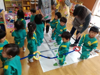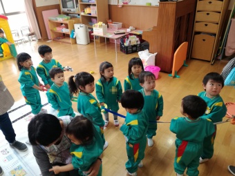 ひよこ組さんは、お外の散歩に備えて、並んで歩く練習をしています。
