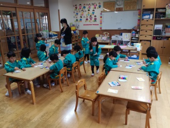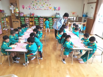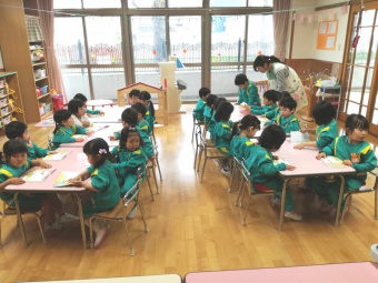 年少さんのクラスでは、ちゃんとお座りをして、シール帳にシール張りをしていますよ!
