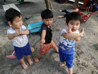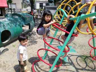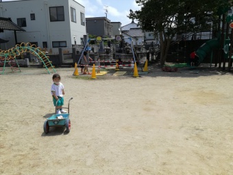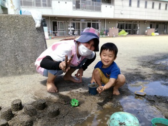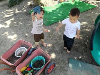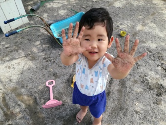 2021.06.17 立正キッズ日記 2歳児さん、元気いっぱい外遊び 手も足も泥だらけにしながら土と水の感触を楽しんだり、得意気に遊具で遊んだりと元気いっぱいの2歳児さんです。 手に登ってくるダンゴムシをしげしげと眺め、行く先を優しく見届けている子もいましたよ。