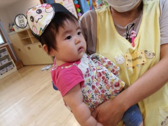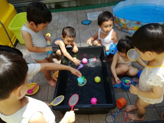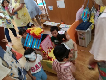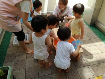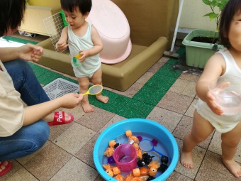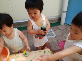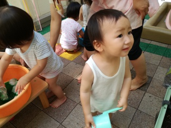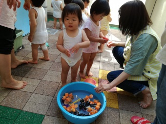 2021.07.19 立正キッズ日記 0,1歳児さん水遊び 今日も暑かったですね。0,1歳児さんの本日は、おまつり遊びです。 中庭で色水をつくってジュースごっこや、金魚すくい、そしてしらたきを使い本場さながらの流しそーめんごっこと盛りだくさん!中に入ってからはおみこしでワッショイワッショイとおまつり気分。 とっても楽しかったので、また今度もおまつりごっこしようねと先生とお約束しました。