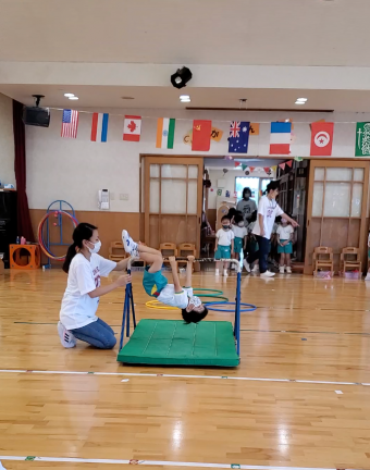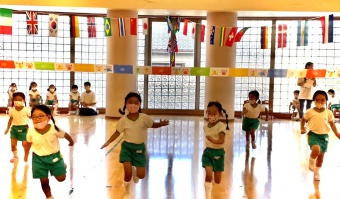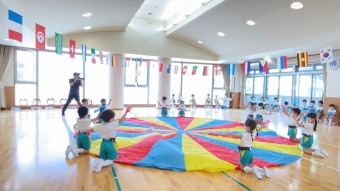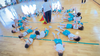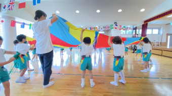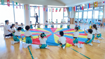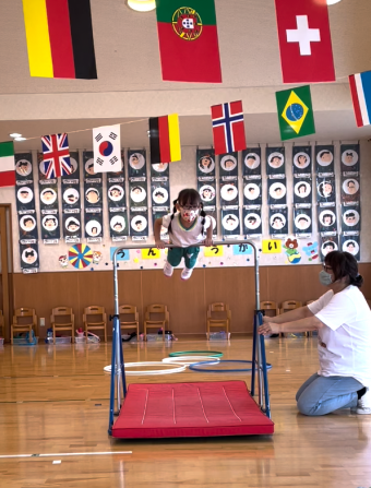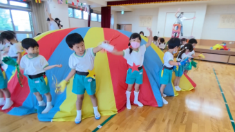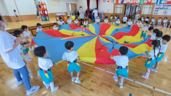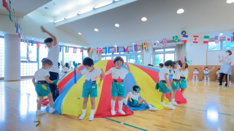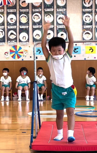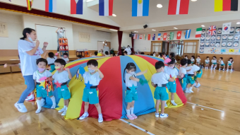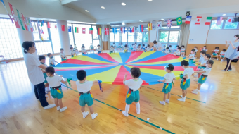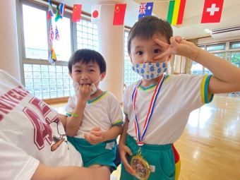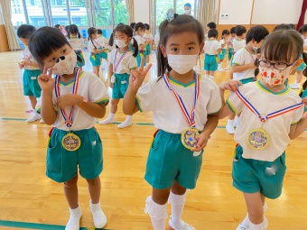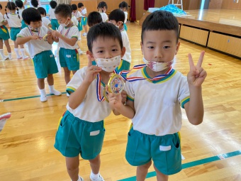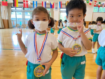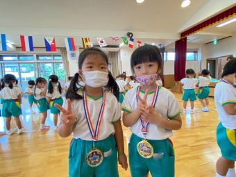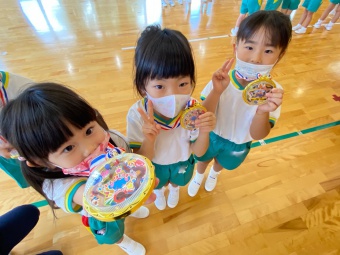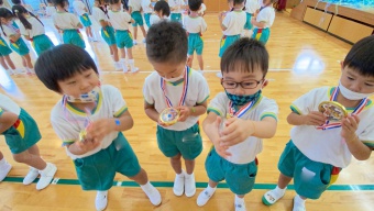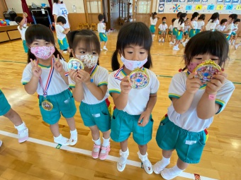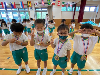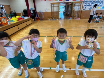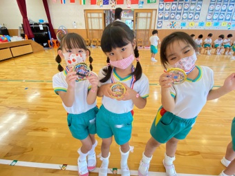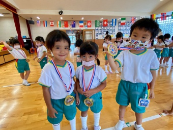 2021.09.09 立正キッズ日記 年中組さん 運動会ごっこ 沢山の笑顔溢れる様子は、この日ホールにて行った年中組運動会ごっこの模様です。 カラフルに彩られたホールで準備運動から始まり、かけっこや巧緻走、そしてバルーンと子供たちはがんばりました。 終わりにもらったメダルがとても嬉しかったようで、いつまでも眺めていました。 この中からいつかオリンピック選手が生まれるかもしれませんね。