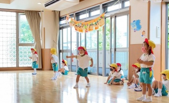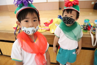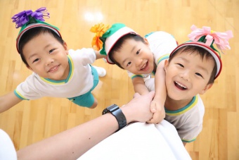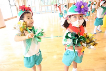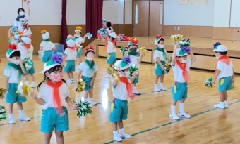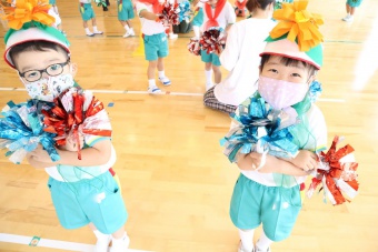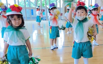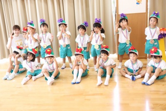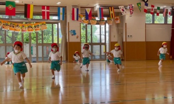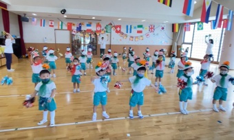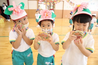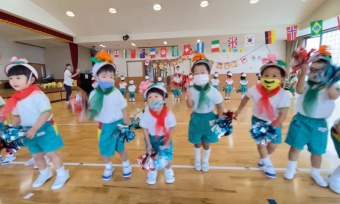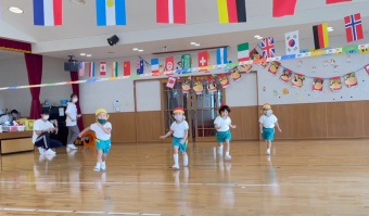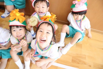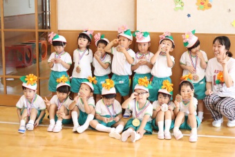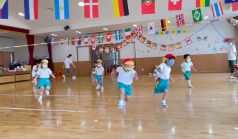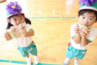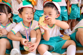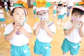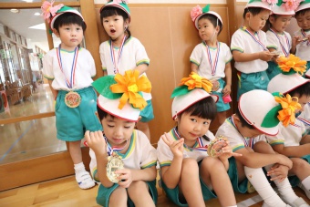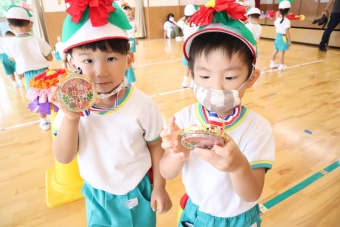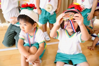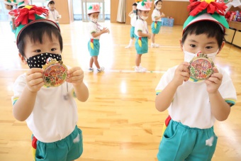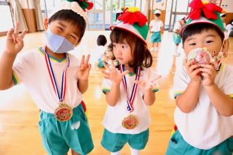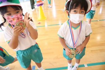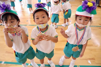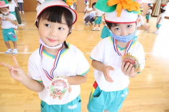 2021.09.10 立正キッズ日記 年少組さん 運動会ごっこ 年中組さんに引き続き、年少組さんの運動会ごっこの様子です。 いつもと同じホールですが、いつもと何か違う・・・。 頭の上にはカラフルな国旗が掲げられ、何やら先生達も沢山。 カメラマンさんに、ビデオの撮影も・・・。 そんな中でも子供たちはいつも通り元気いっぱいにかけっこやダンスを楽しみました。 先生からもらったピカピカメダルを見る子供たちの、なんといい笑顔でしょう!