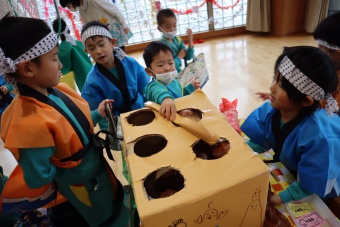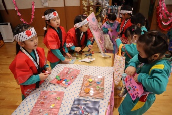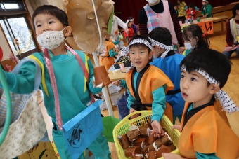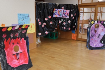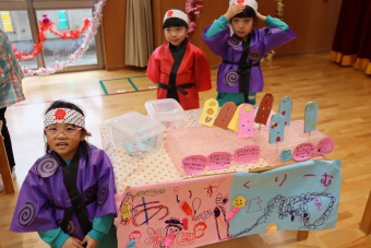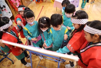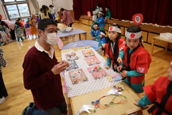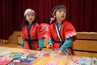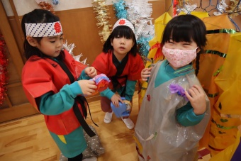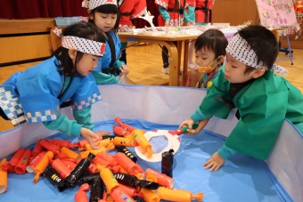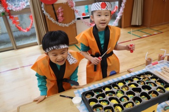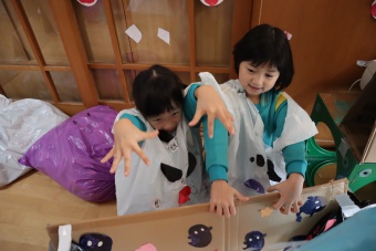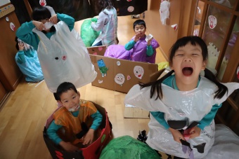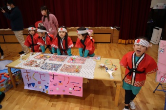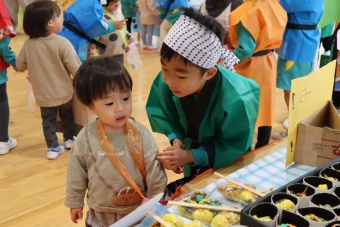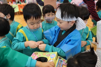 2021.12.16 立正キッズ日記 お店屋さんごっこ 「いらっしゃいませーー!!」 と威勢のよい掛け声がホールから聞こえてきます。 「お~ば~け~だ~ぞ~~」と何やら怪しい声も聞こえてきます。 そう、今日は子供たちがとても楽しみにしていたお店屋さんの開店日です。 それぞれに趣向を凝らした商品がずらりと並び、どれも購買意欲を掻き立てるものばかりです。 年長組さんの開いたお店に来てくれた小さなお客さん達は目を輝かせ、とても楽しんでいってくれたようです。 この模様はYouTubeにしてお届けしますので、そちらもご覧くださいね。